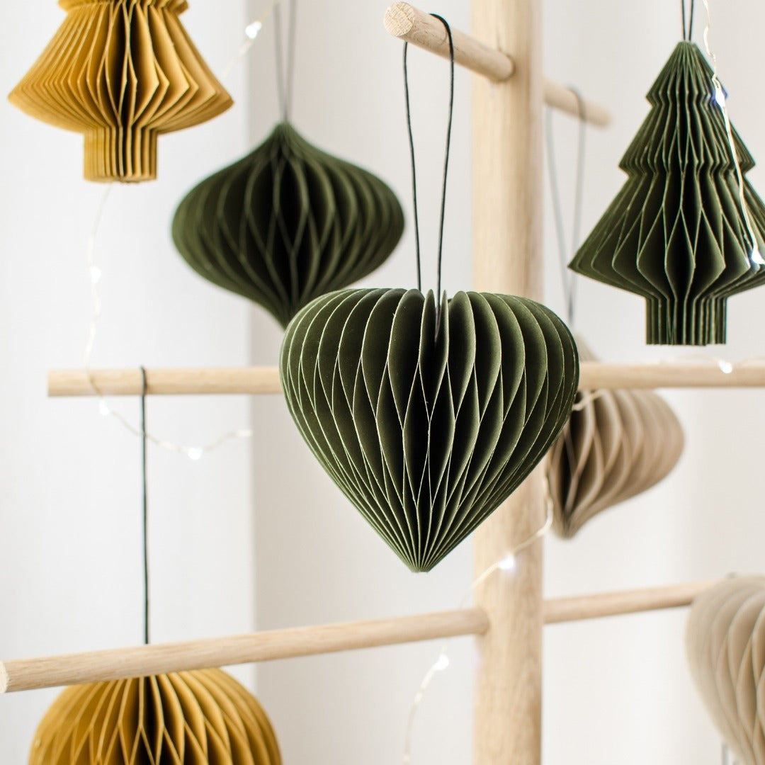 Each ornament is hand made from FSC certified paper and comes with a leather string.