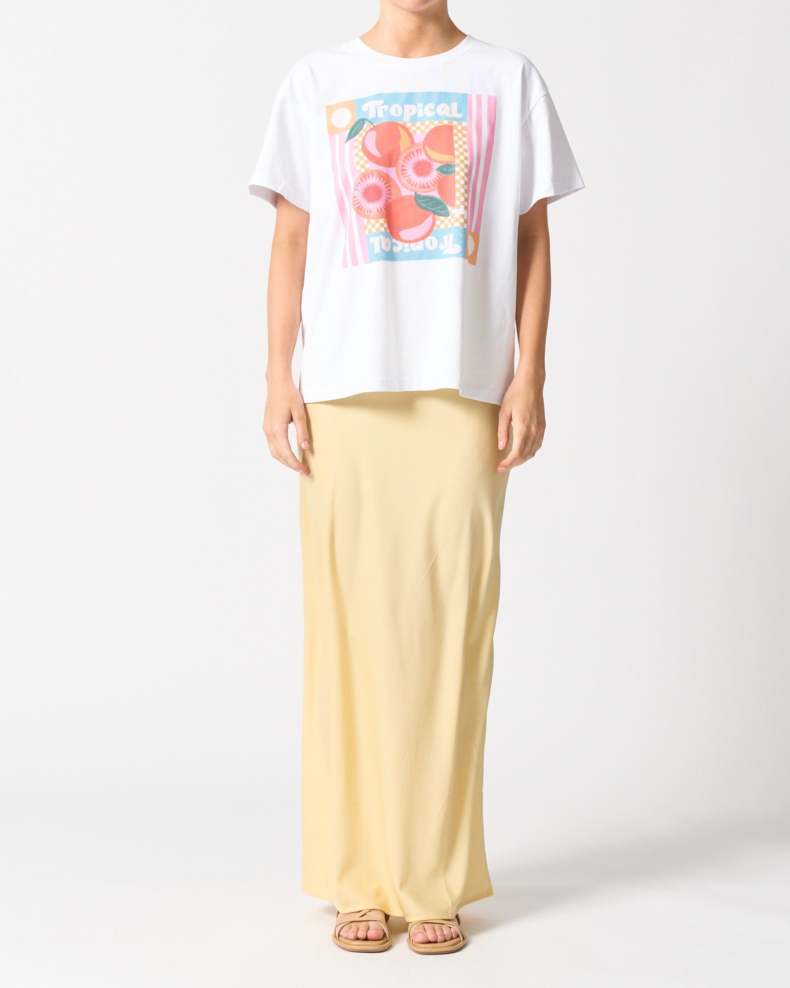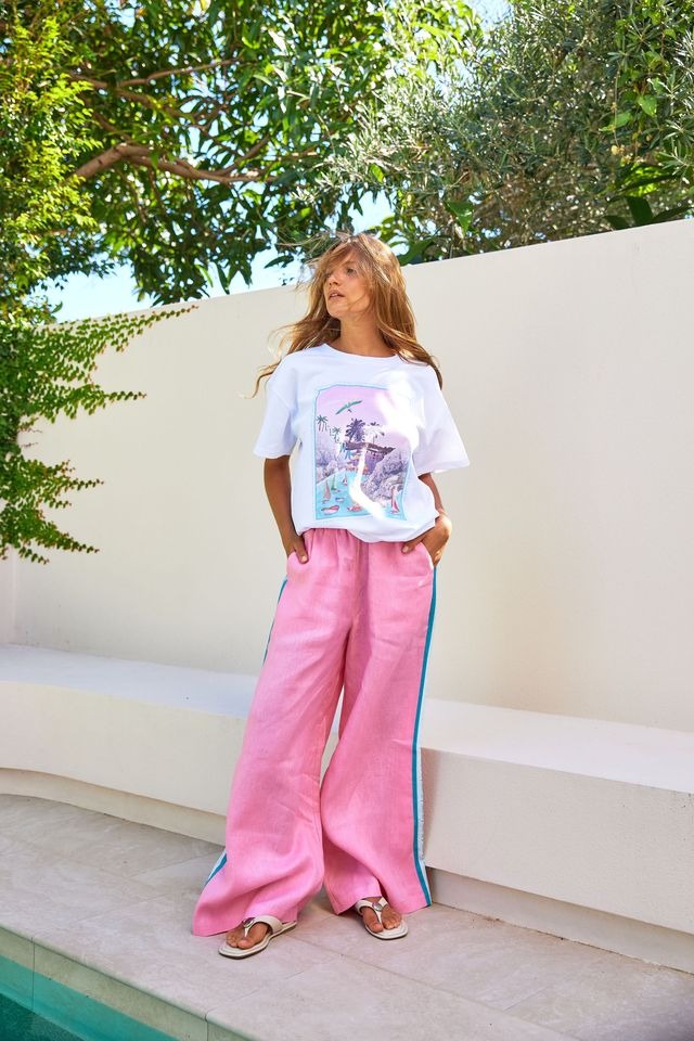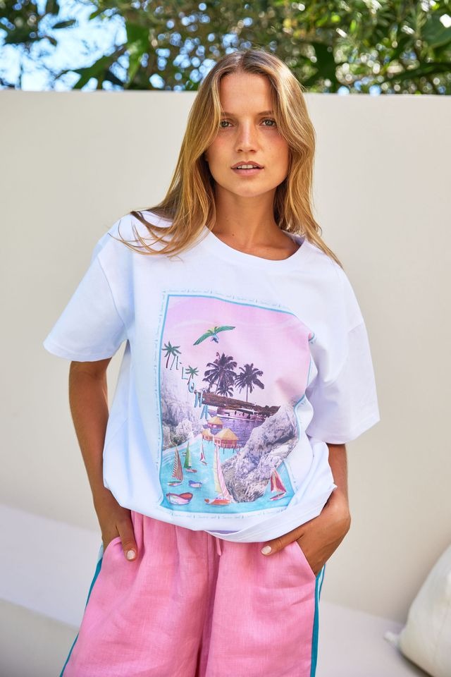 Transport yourself to an endless holiday with the Lison tee. A dreamy coastal scene is brought to life in retro postcard style, perfect for beach days or brunching in the sun. Wear it loose with linen shorts or tucked into your favourite pants.