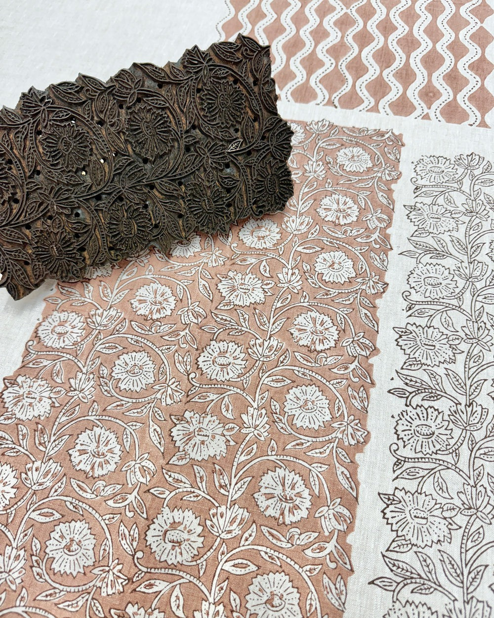 Cedella is a classic floral design which is given depth and interest by the beautiful imperfection of the hand block printed process and finished with knife edge.