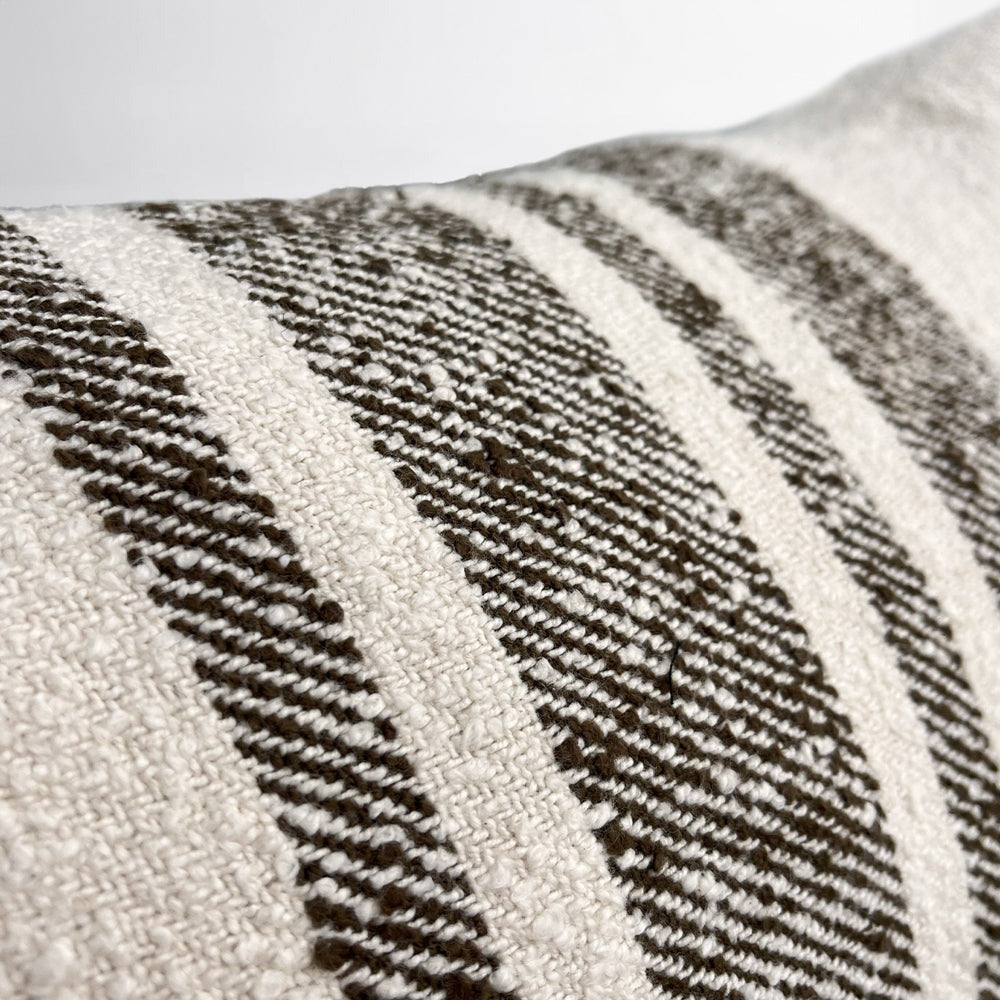 - Earthy contrast — bold central stripes in chocolate and deep olive on an ivory base
