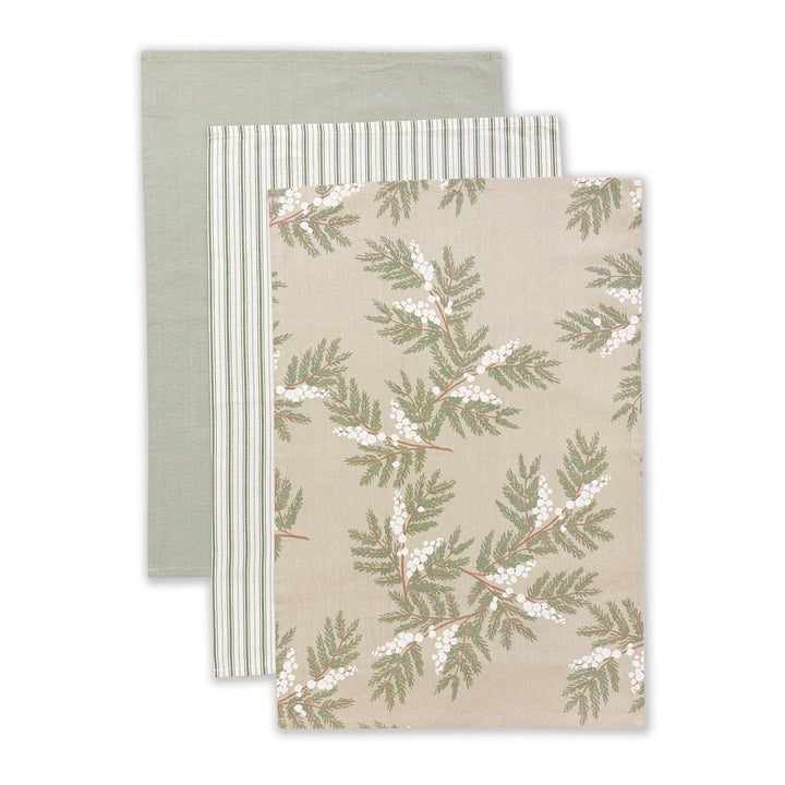 Hand-painted Snowberry design printed on an oatmeal cotton base. Available in coordinating products. Designed in-house. Teatowel pack includes a print, a woven stripe and a jetty oatmeal.