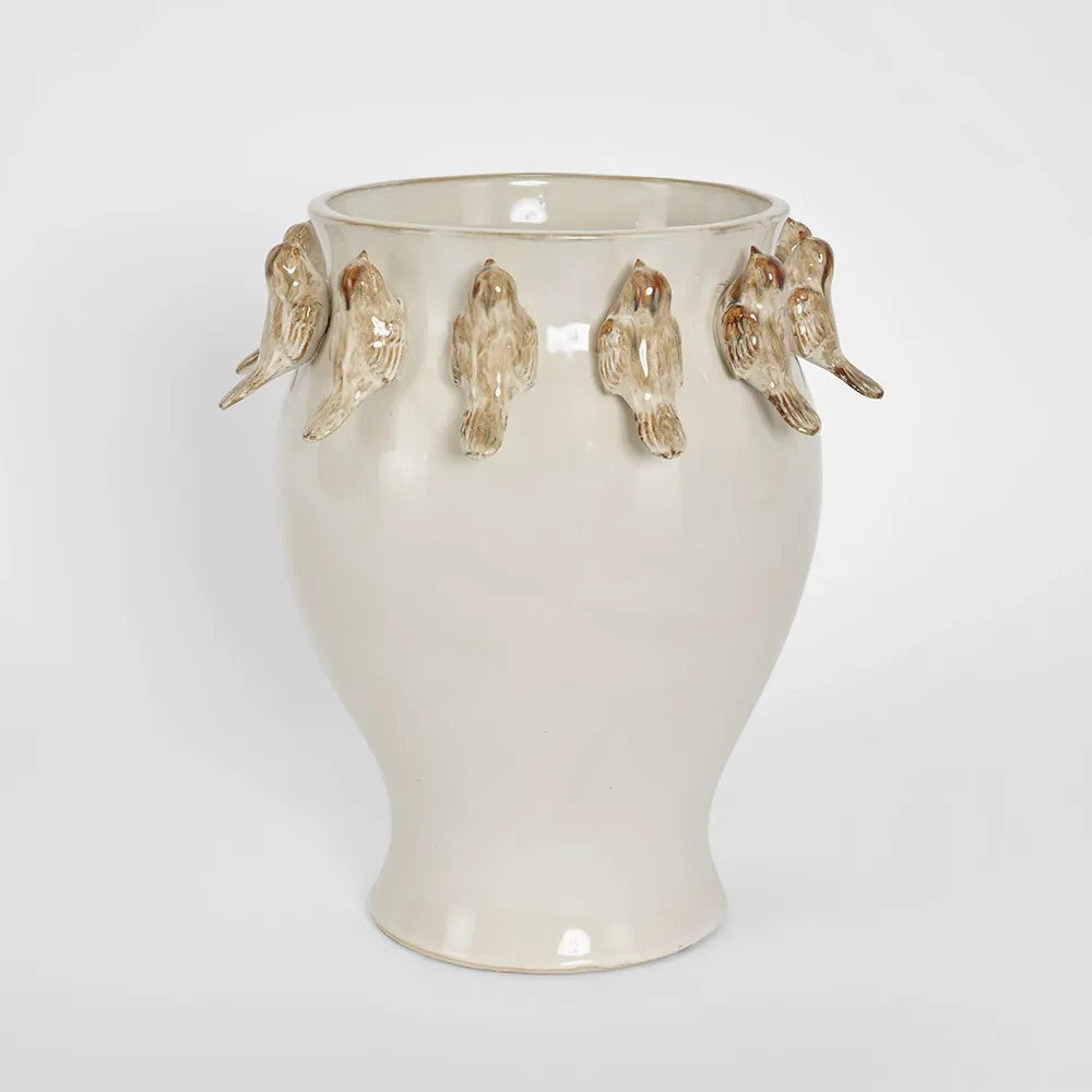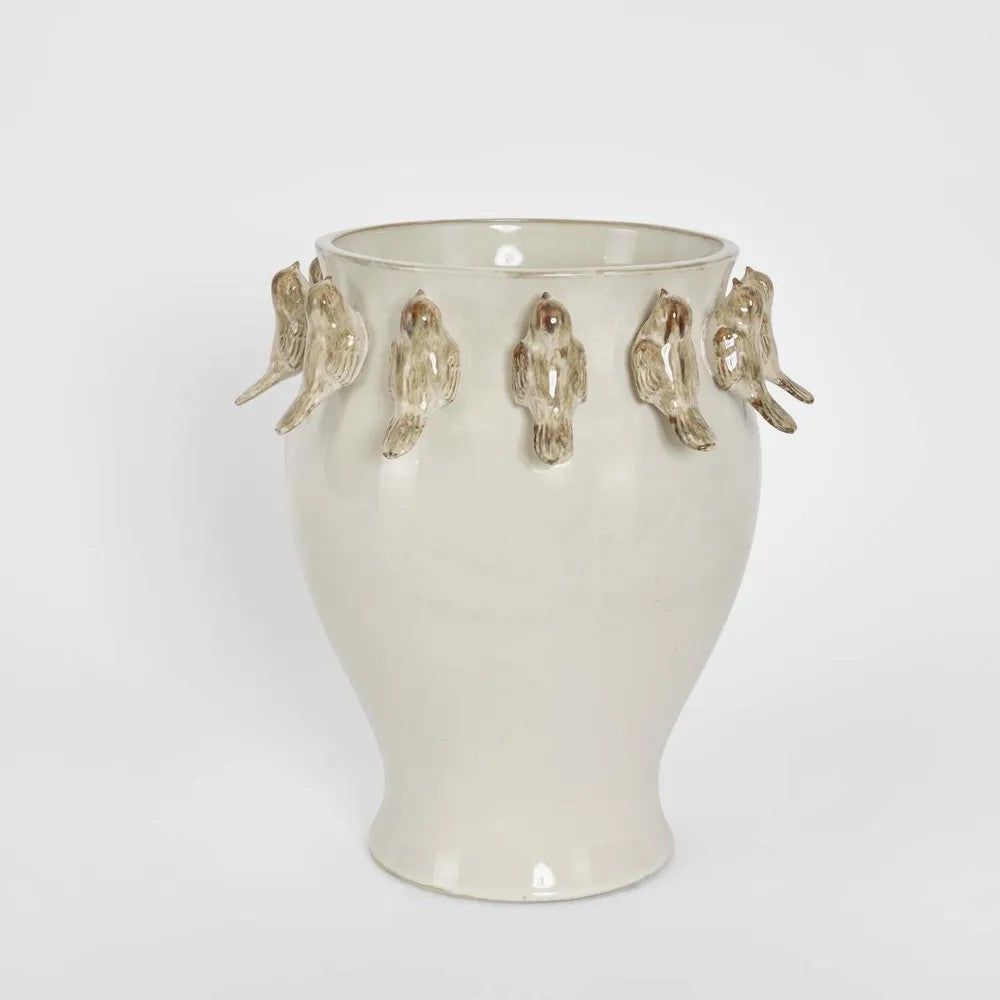 Add a touch of whimsy and sculptural beauty to your styling with the Bird Vase in White. Featuring a delicate flock of tiny birds perched around the rim, this charming ceramic piece brings personality, texture and artistic detail to any interior.