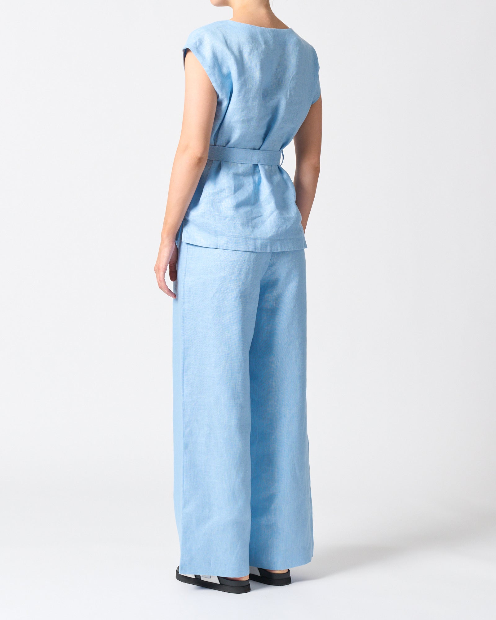 Clean, minimal, and quietly elevated—the Rhodes Top in Sky Blue is your answer to effortless refinement. Crafted from a lightweight linen blend, this sleeveless silhouette features a softly structured shape with a wide boat neckline, cap sleeves, and a matching waist tie to cinch in and flatter. Polished enough to dress up, relaxed enough to wear every day.